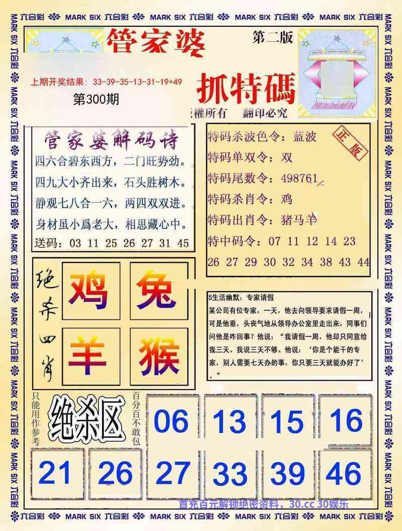 | 300期:绝杀三肖【鼠-鸡-猪】开:虎40准 |